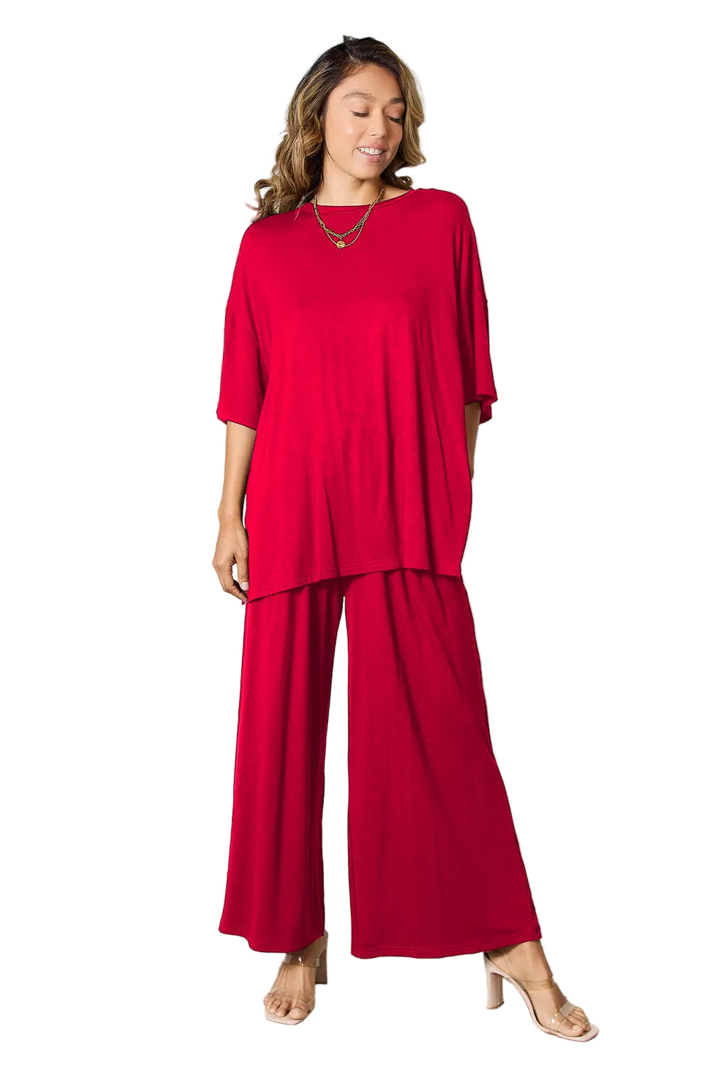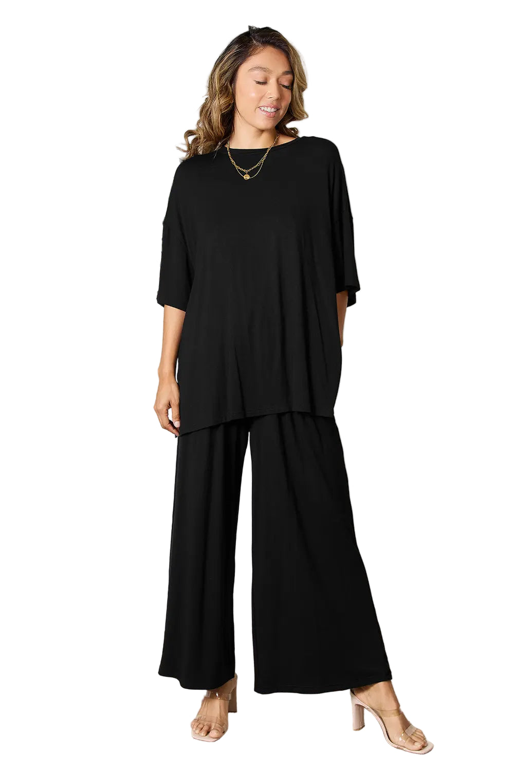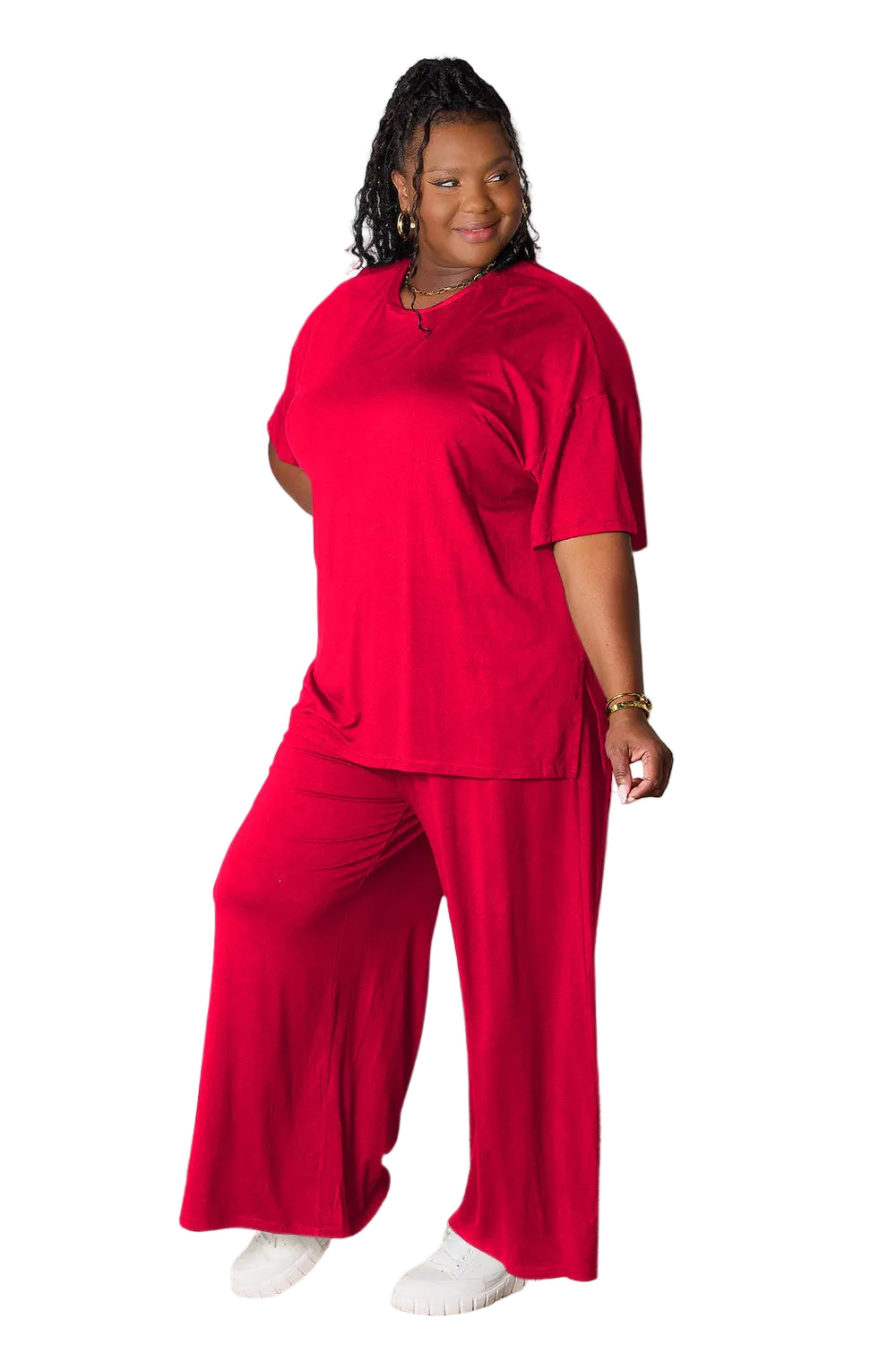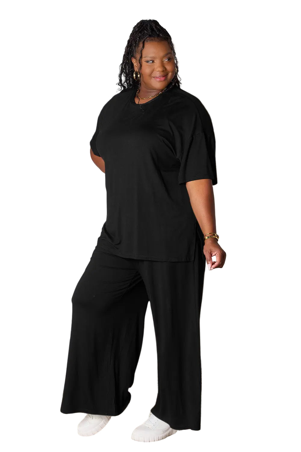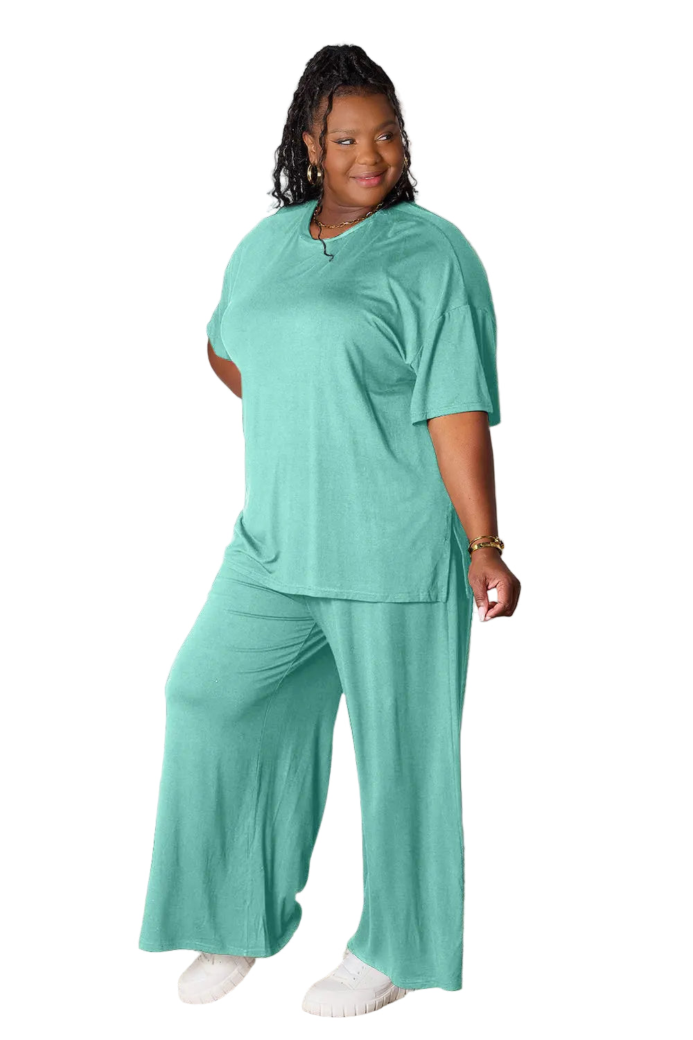 Embrace the allure of romance with the Double Take Full Size Round Neck Slit Top and Pants Set. This enchanting two-piece ensemble caresses your curves, crafted from a soft blend of 95% rayon and 5% spandex, offering a slight stretch that moves with you.