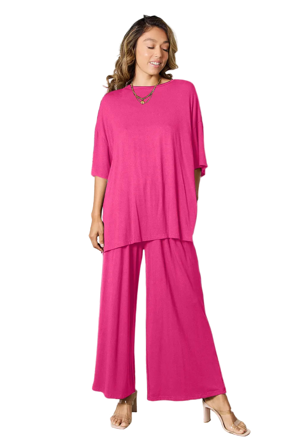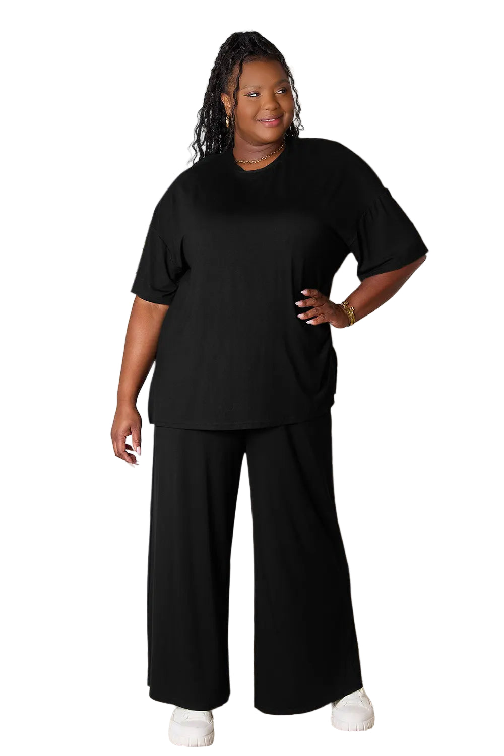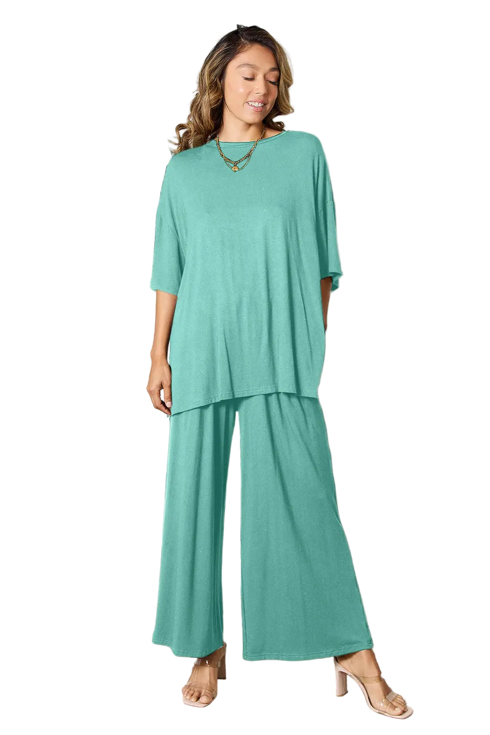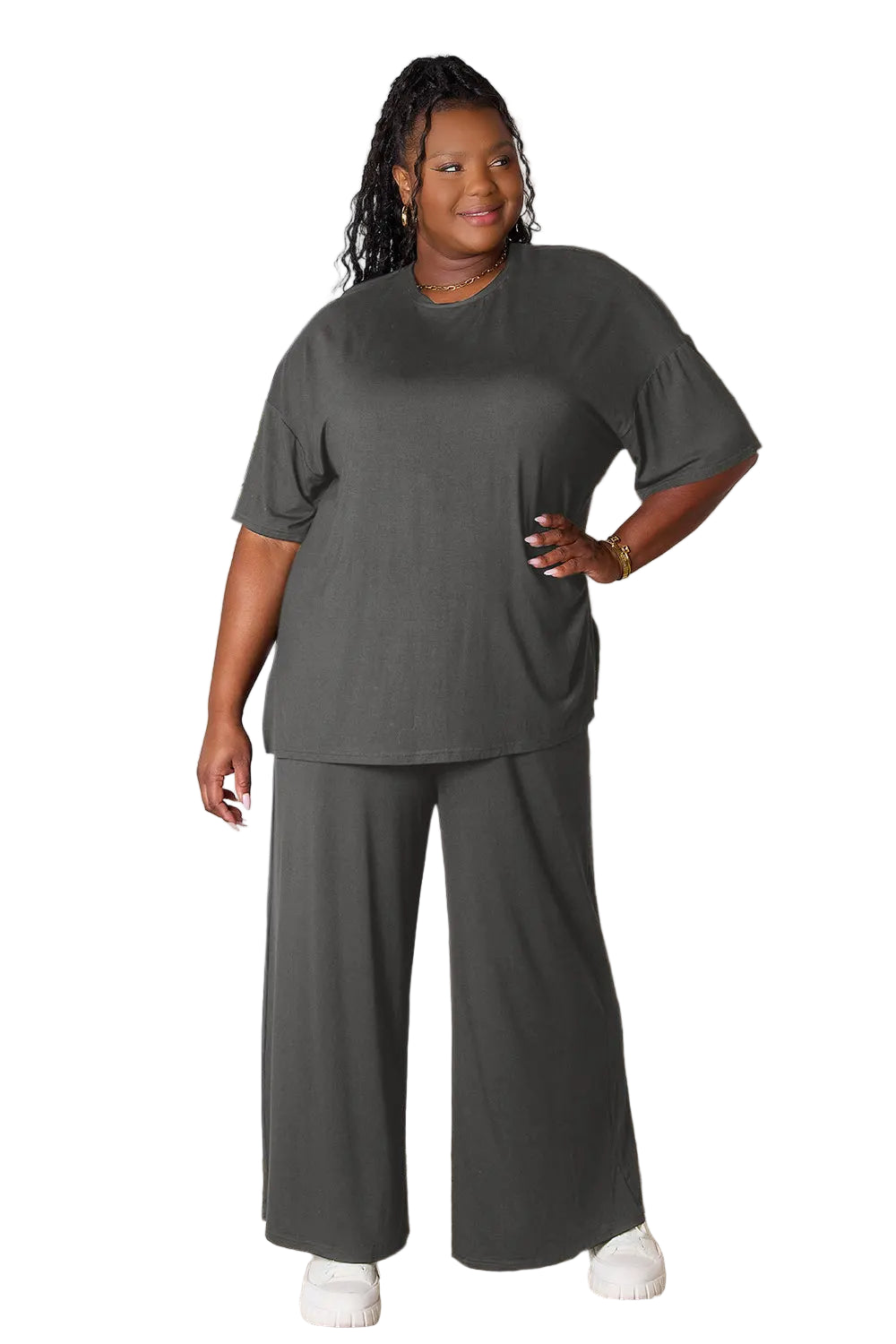 Embrace the allure of romance with the Double Take Full Size Round Neck Slit Top and Pants Set. This enchanting two-piece ensemble caresses your curves, crafted from a soft blend of 95% rayon and 5% spandex, offering a slight stretch that moves with you.