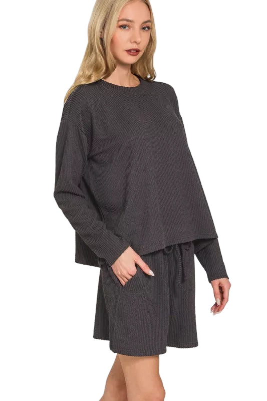 Embrace the gentle caress of comfort with the Zenana Corded Rib Long Sleeve Tee and Shorts Set. This enchanting ensemble wraps you in a soft embrace, perfect for lazy afternoons or spontaneous outings. The ribbed texture whispers of warmth, inviting you to indulge in its cozy allure.