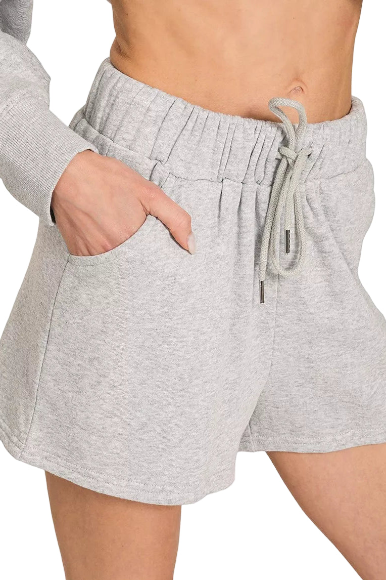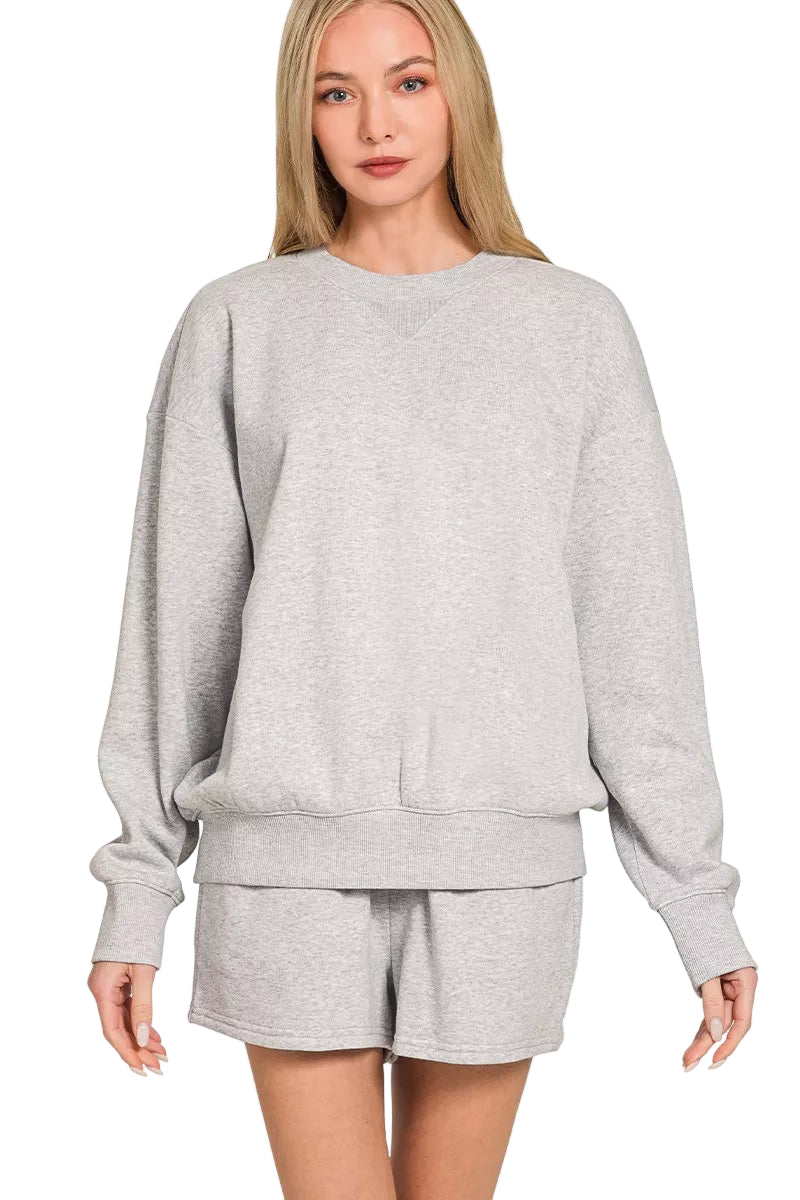 Wrap yourself in the tender embrace of the Zenana Fleece Long Sleeve Sweatshirts & Shorts Set, where comfort meets romance. This heather grey loungewear set, crafted from a luxurious cotton blend, whispers sweet nothings of softness against your skin.