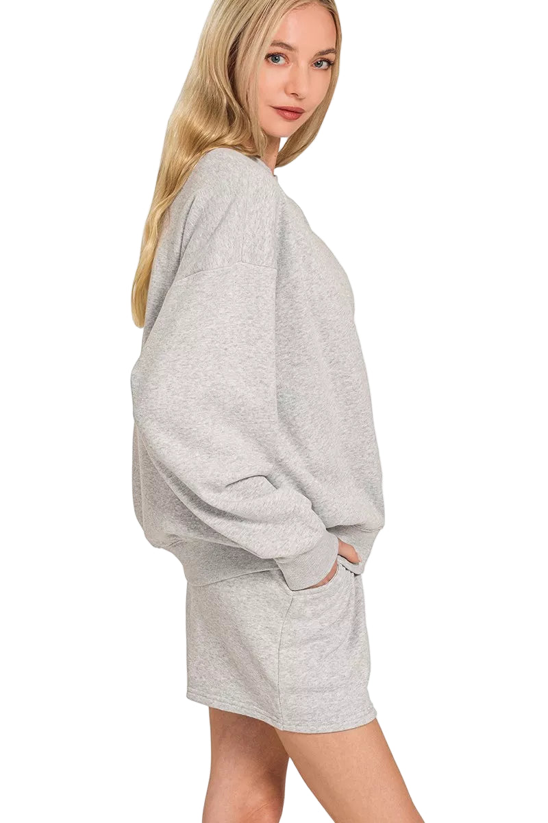 The oversized sweatshirt, with its gentle ribbed detailing, invites you to relax and unwind, while the matching shorts dance gracefully around your silhouette. Perfect for cozy evenings or leisurely days, this set embodies effortless elegance, allowing you to feel both chic and comfortable.