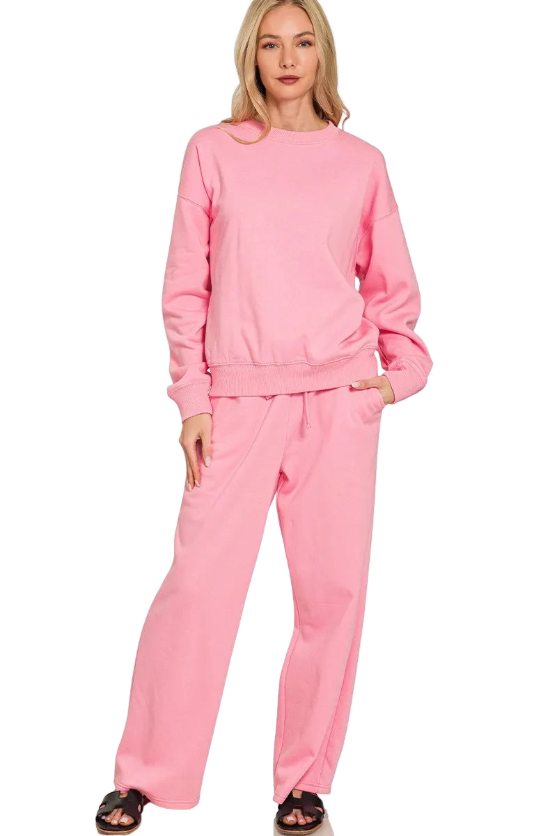 Wrap yourself in the tender embrace of the Zenana Fleece Long Sleeve Top and Sweatpants Set, where comfort meets romance. This exquisite two-piece ensemble whispers sweet nothings of warmth and softness, perfect for those intimate evenings spent at home or leisurely strolls under the crisp autumn sky.