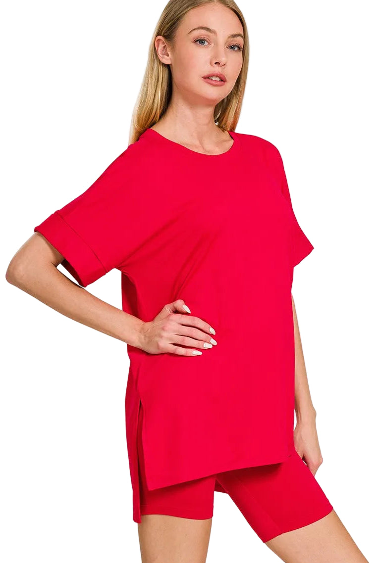 The classic round neck top gracefully complements the modern biker shorts, creating a harmonious blend of elegance and sportiness. Perfect for leisurely strolls or cozy evenings at home, this set invites you to indulge in its chic simplicity.