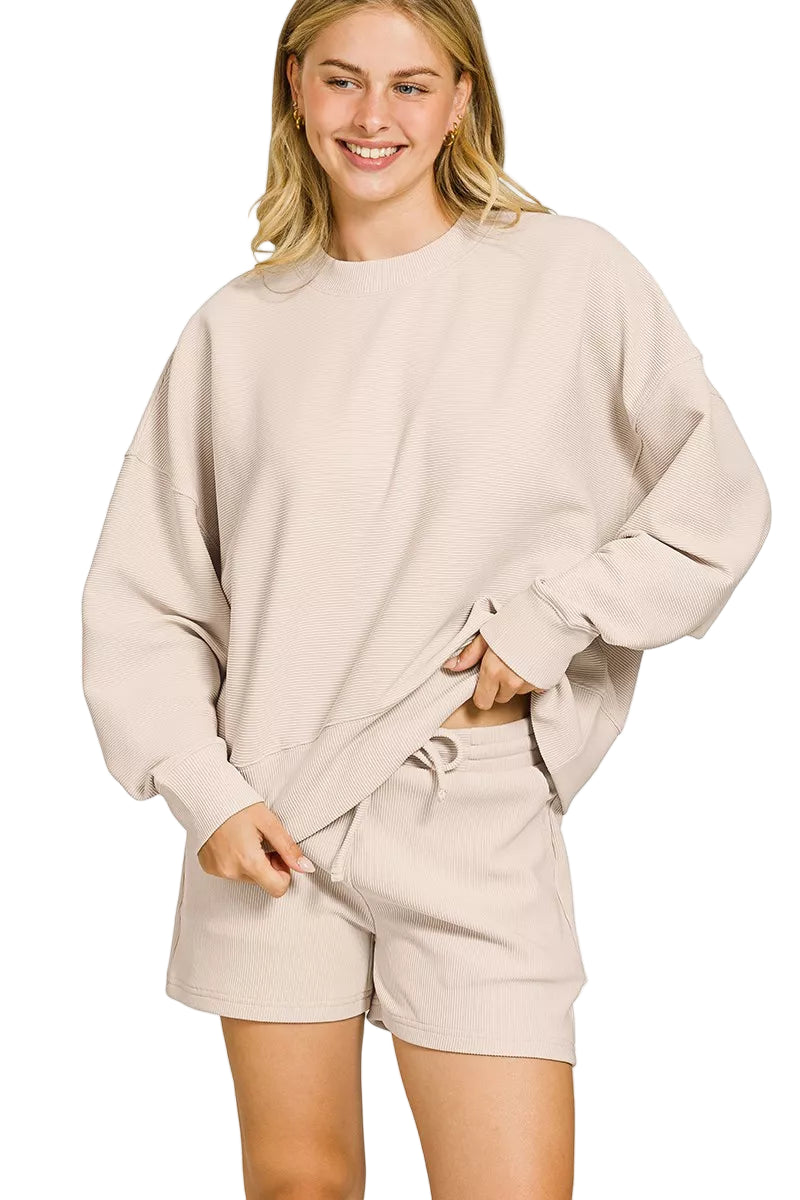 Wrap yourself in the gentle embrace of our Ribbed Round Neck Pullover and Shorts Set, where comfort meets elegance. The soft, ribbed texture caresses your skin, inviting you to indulge in moments of leisure and love.