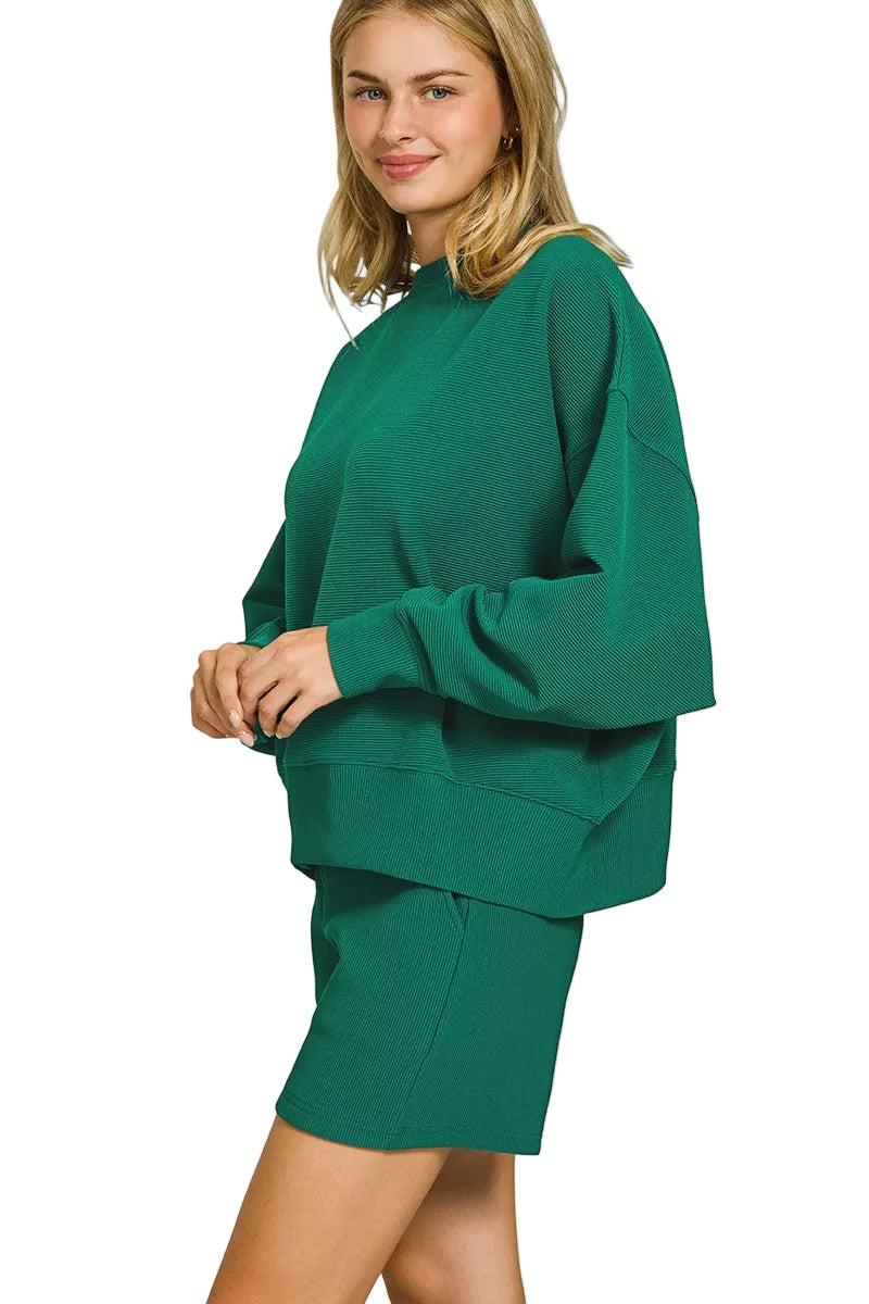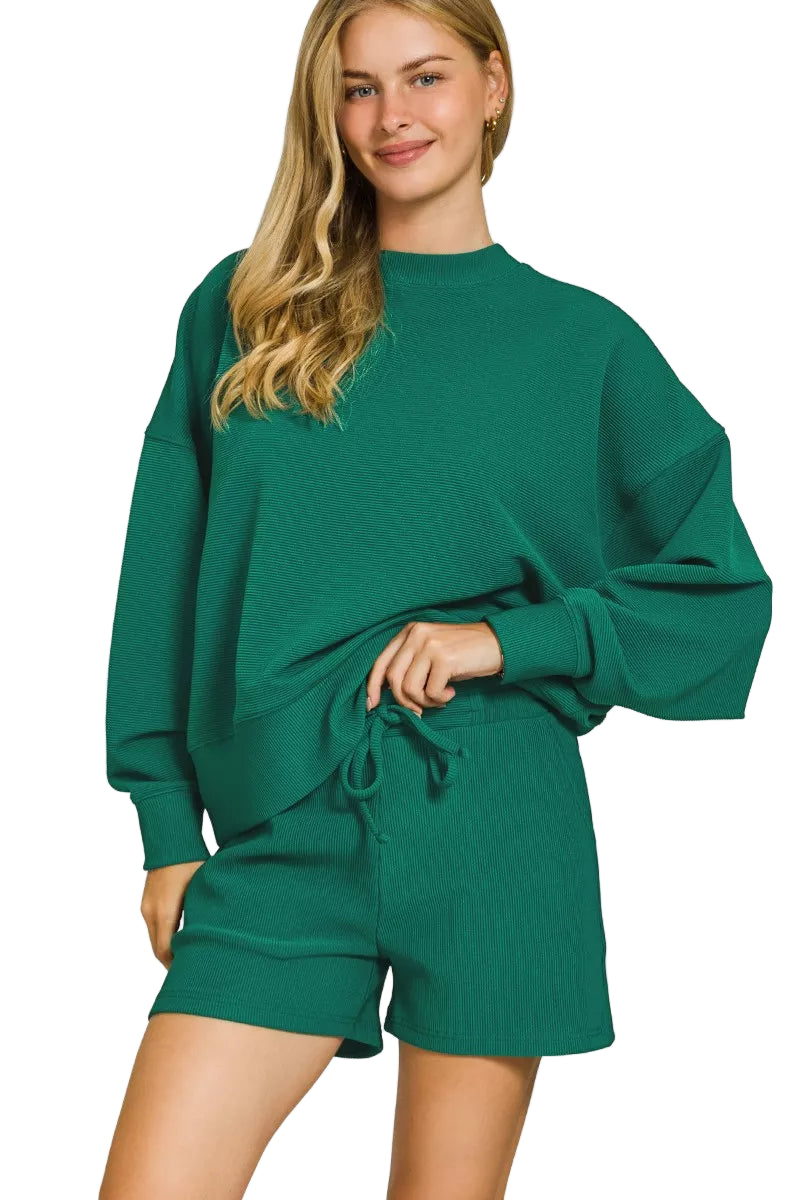 Zenana Ribbed Round Neck Pullover and Shorts Set