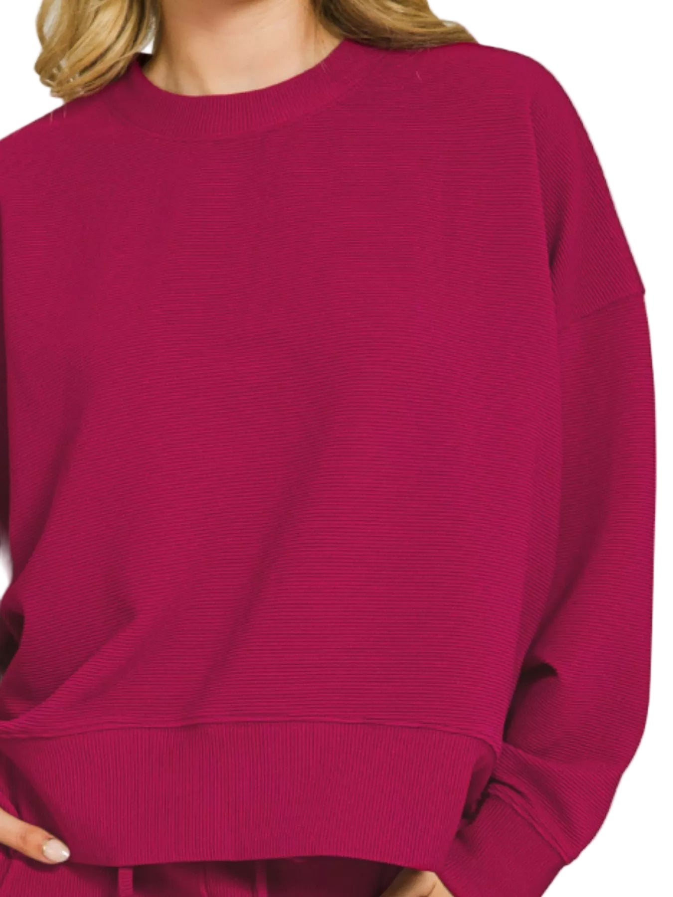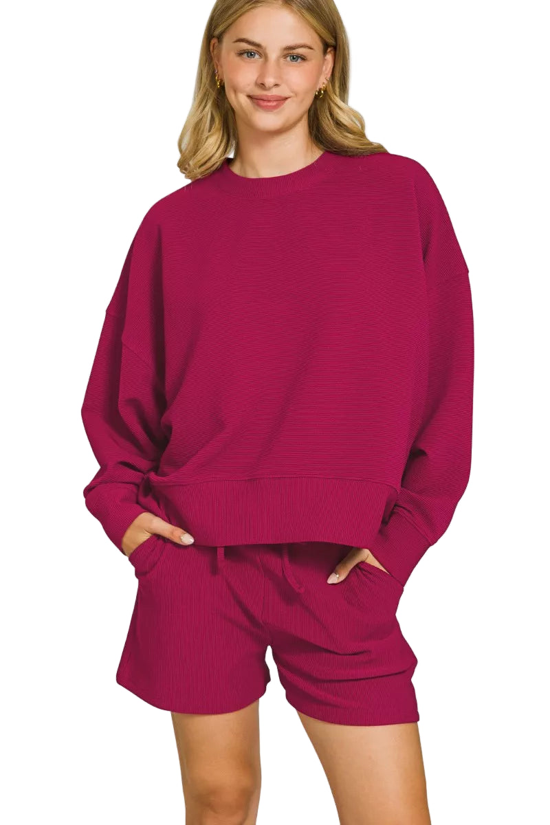 Zenana Ribbed Round Neck Pullover and Shorts Set