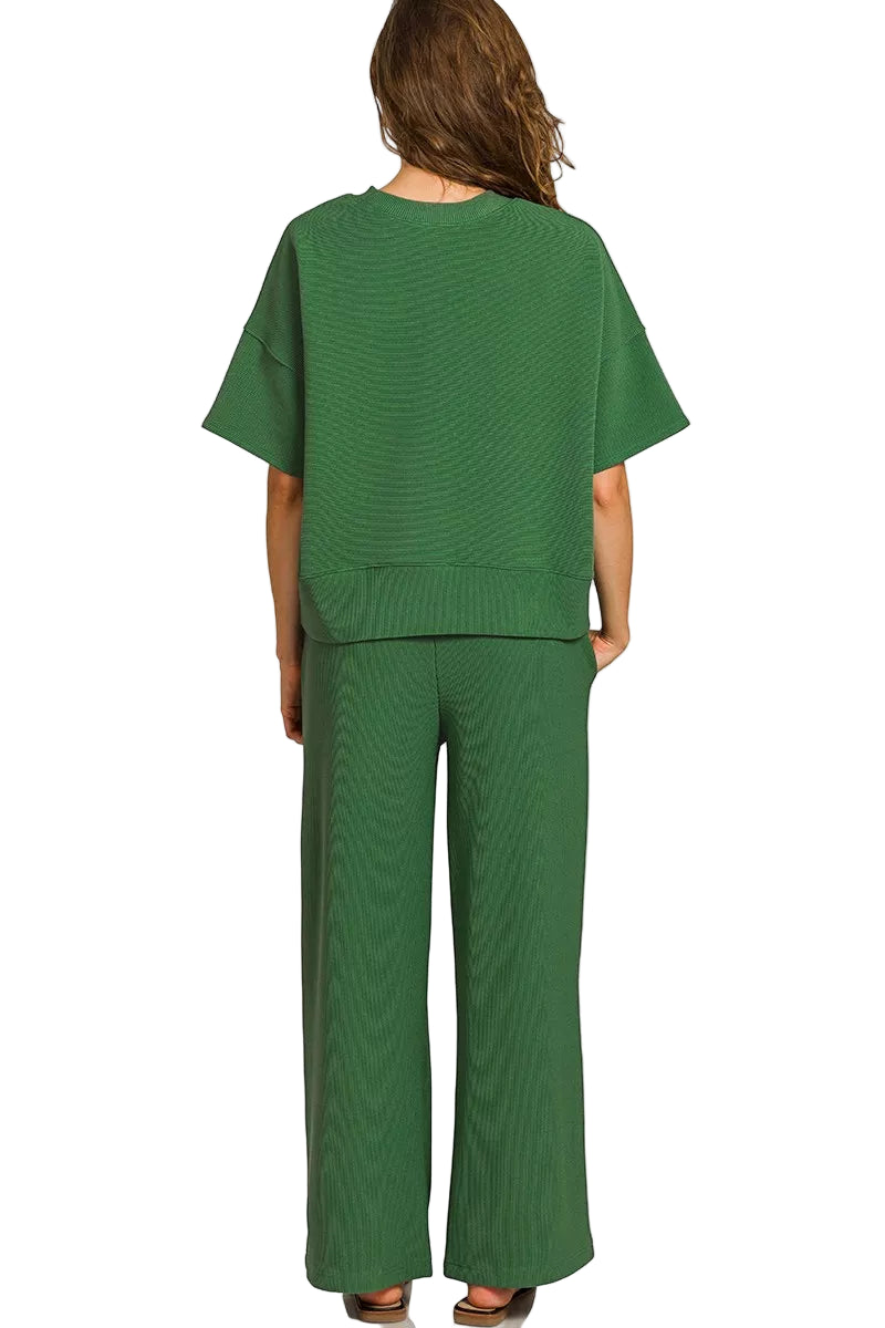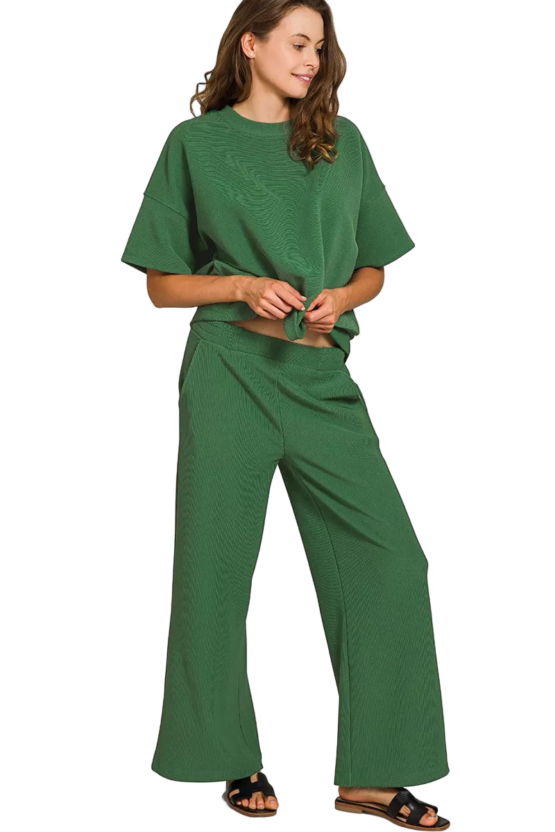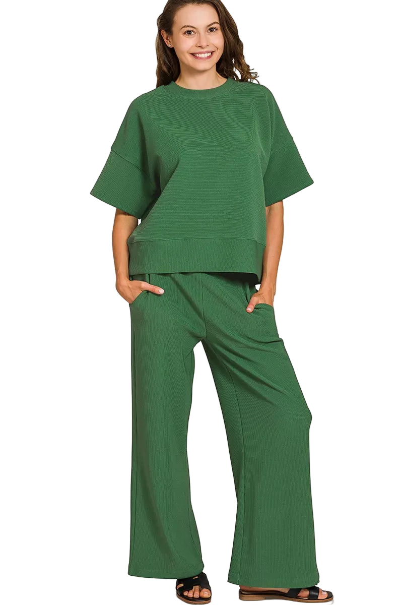 Embrace the essence of comfort and style with the Zenana Ribbed Round Neck Tee & Pants Set. This enchanting duo, crafted from soft, breathable fabric, wraps you in a gentle embrace, perfect for those intimate moments at home or spontaneous outings.