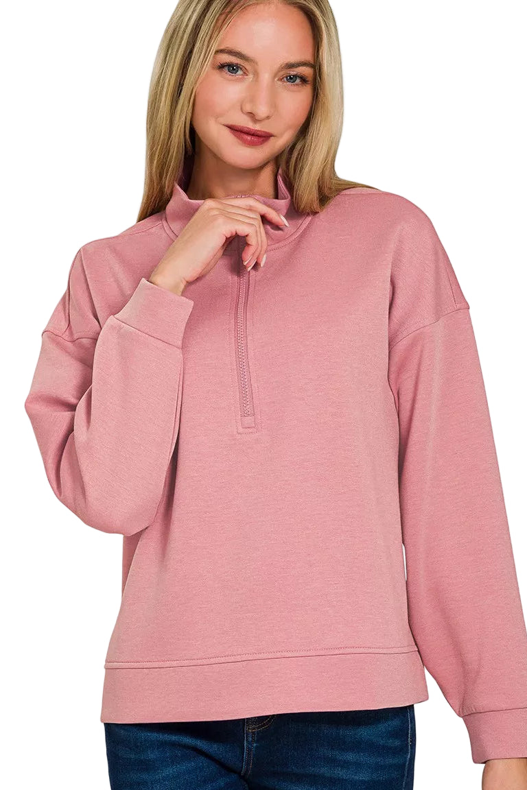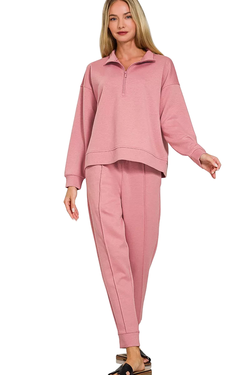 Wrap yourself in the tender embrace of the Zenana Scuba Half Zip Pullover and Jogger Set, where comfort meets elegance. This enchanting duo invites you to indulge in moments of leisure, whether you're sipping coffee at dawn or strolling through sunlit streets.