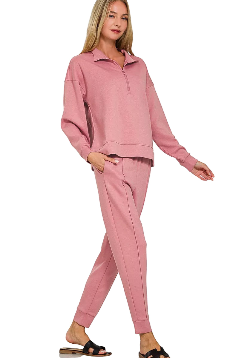 The pullover, with its charming half zip design, whispers of effortless style, while the joggers cradle your form in a relaxed fit. Crafted from soft, cozy scuba fabric, this set is a delightful companion for your everyday adventures.