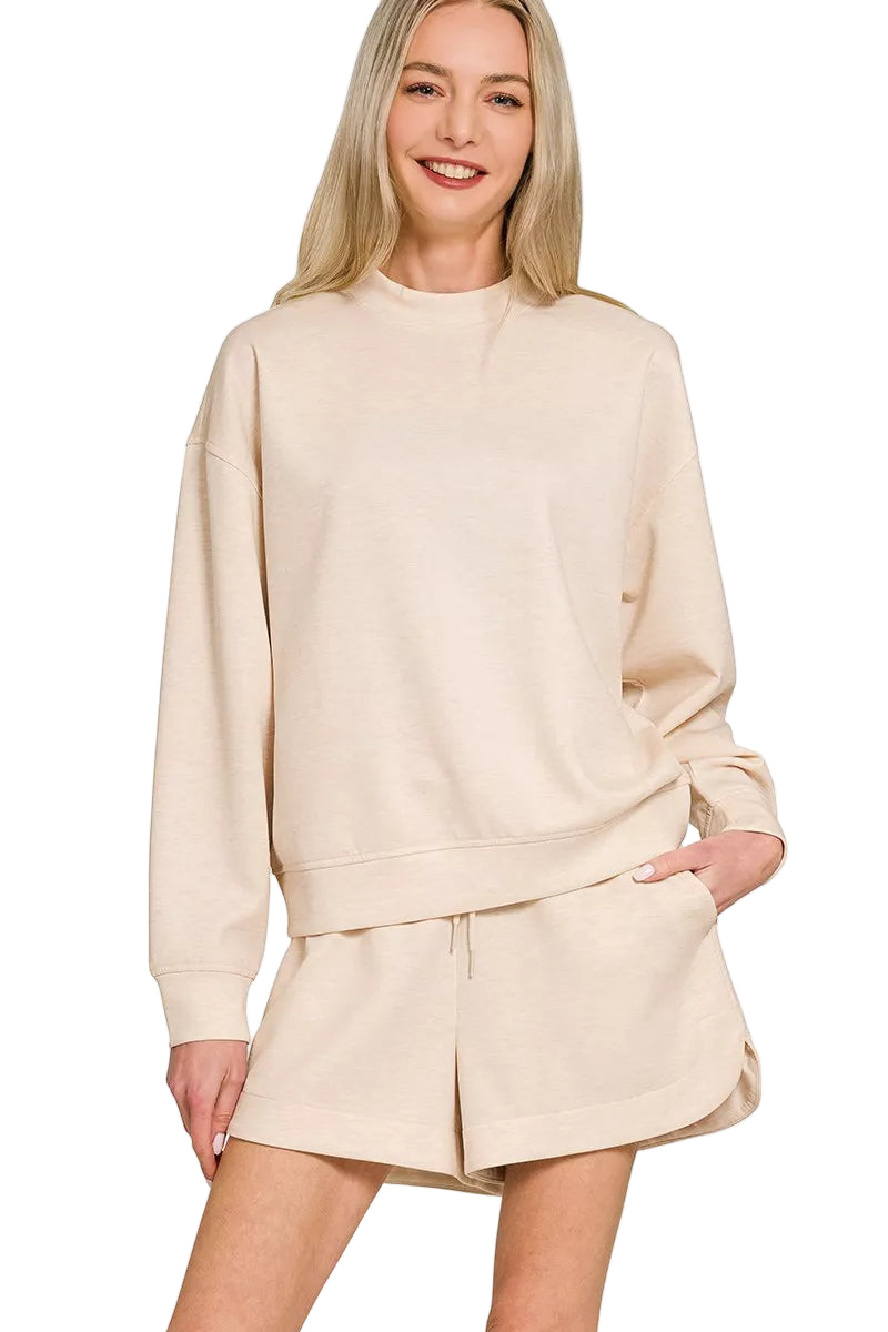 This coordinated set includes a scuba fabric long sleeve sweatshirt and matching shorts for a sporty and stylish look. The scuba fabric offers a modern and structured feel, perfect for both lounging and active wear. The long sleeve sweatshirt provides extra coverage and warmth, while the shorts offer a comfortable and casual option for the bottom half. This set is perfect for a laid-back yet put-together outfit for various activities. Enjoy the comfort and versatility of this scuba long sleeve sweatshirt and shorts set for effortless style all day long.
