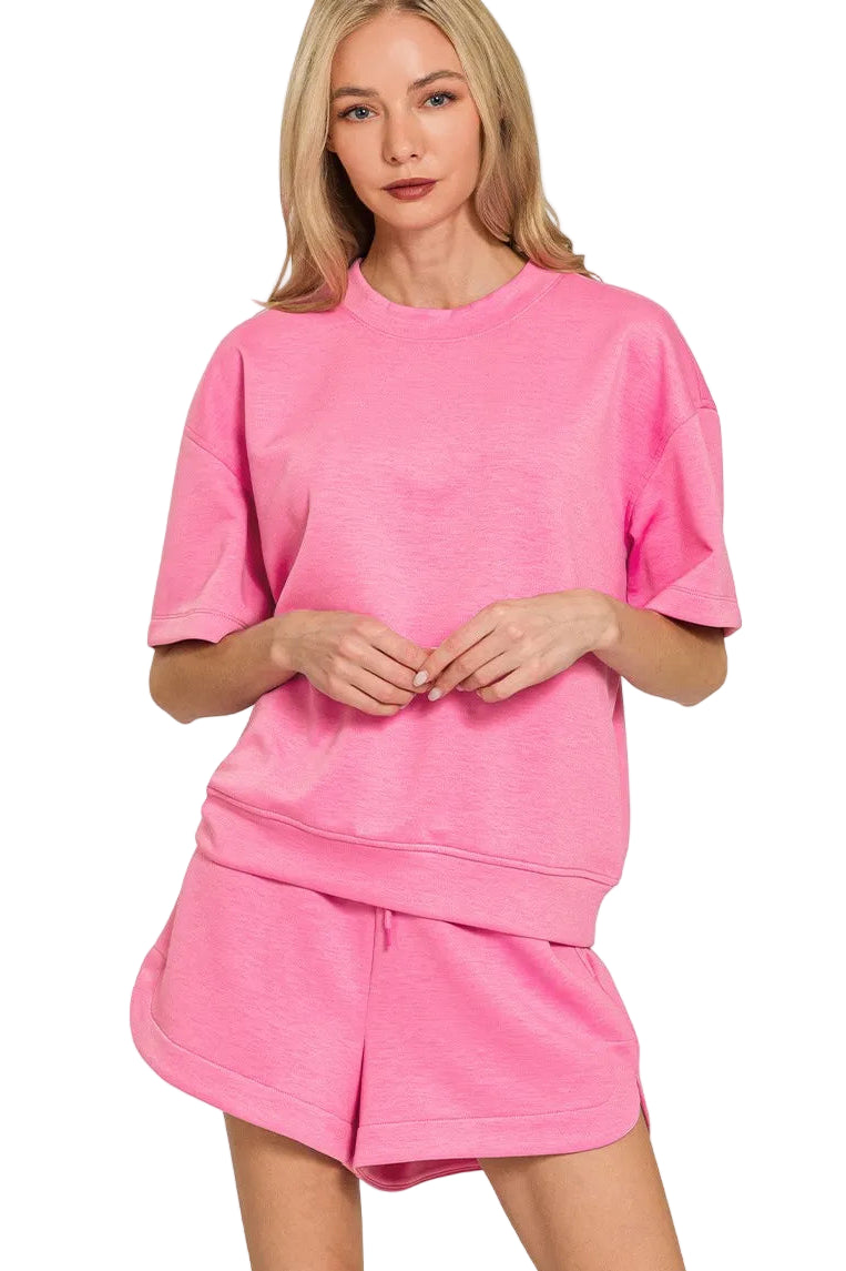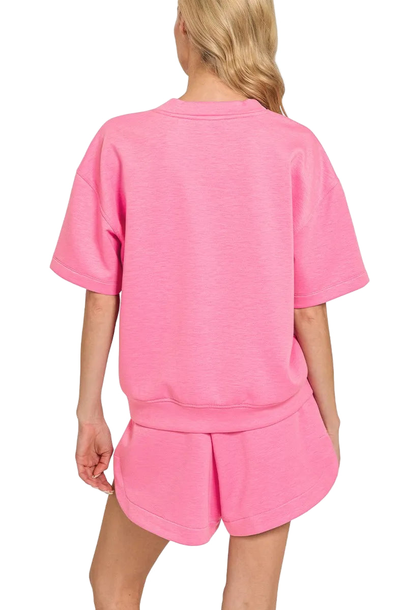 Embrace the warmth of summer with our enchanting Scuba Short Sleeve Top & Shorts Set. Crafted from a luxurious blend of materials, this set caresses your skin, offering a form-fitting silhouette that celebrates your natural beauty. Each piece is designed to flow effortlessly with your movements, making it perfect for sunlit strolls or cozy afternoons at home.
