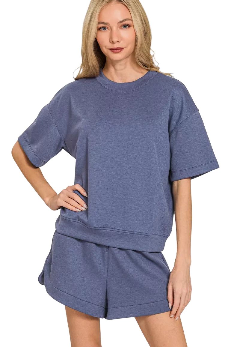 Embrace the essence of comfort and style with the Zenana Scuba Short Sleeve Top & Shorts Set. This enchanting duo, draped in a captivating blue indigo hue, invites you to indulge in moments of leisure and tranquility. The oversized tee, with its gentle embrace, dances gracefully with the matching shorts, creating a harmonious silhouette that flatters every curve.