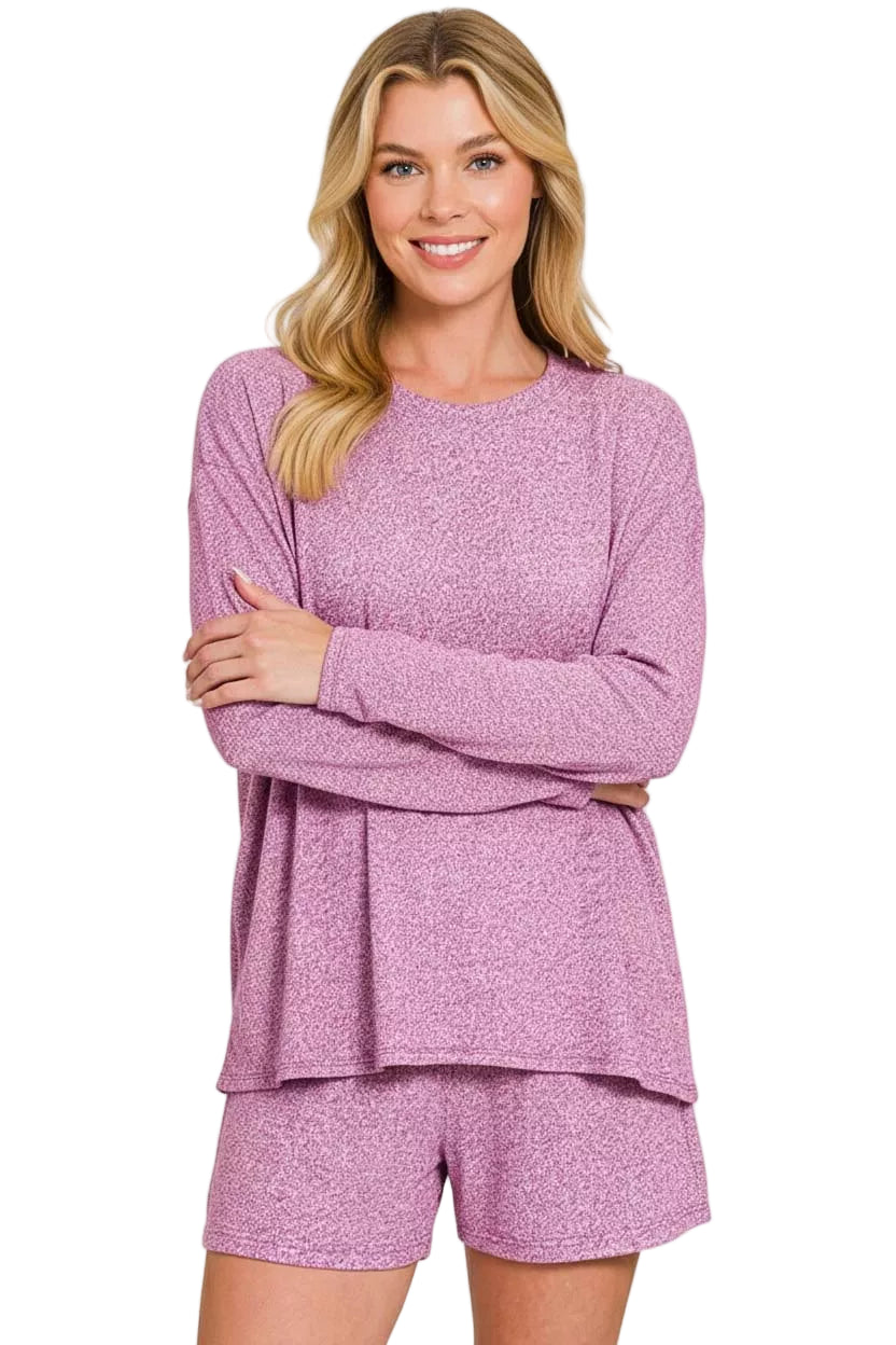 Embrace the gentle caress of the Zenana Soft Melange Long Sleeve Tee and Shorts Set, a perfect union of comfort and style. Crafted from a delicate blend of polyester and spandex, this set envelops you in a soft embrace, making every moment feel like a warm hug.
