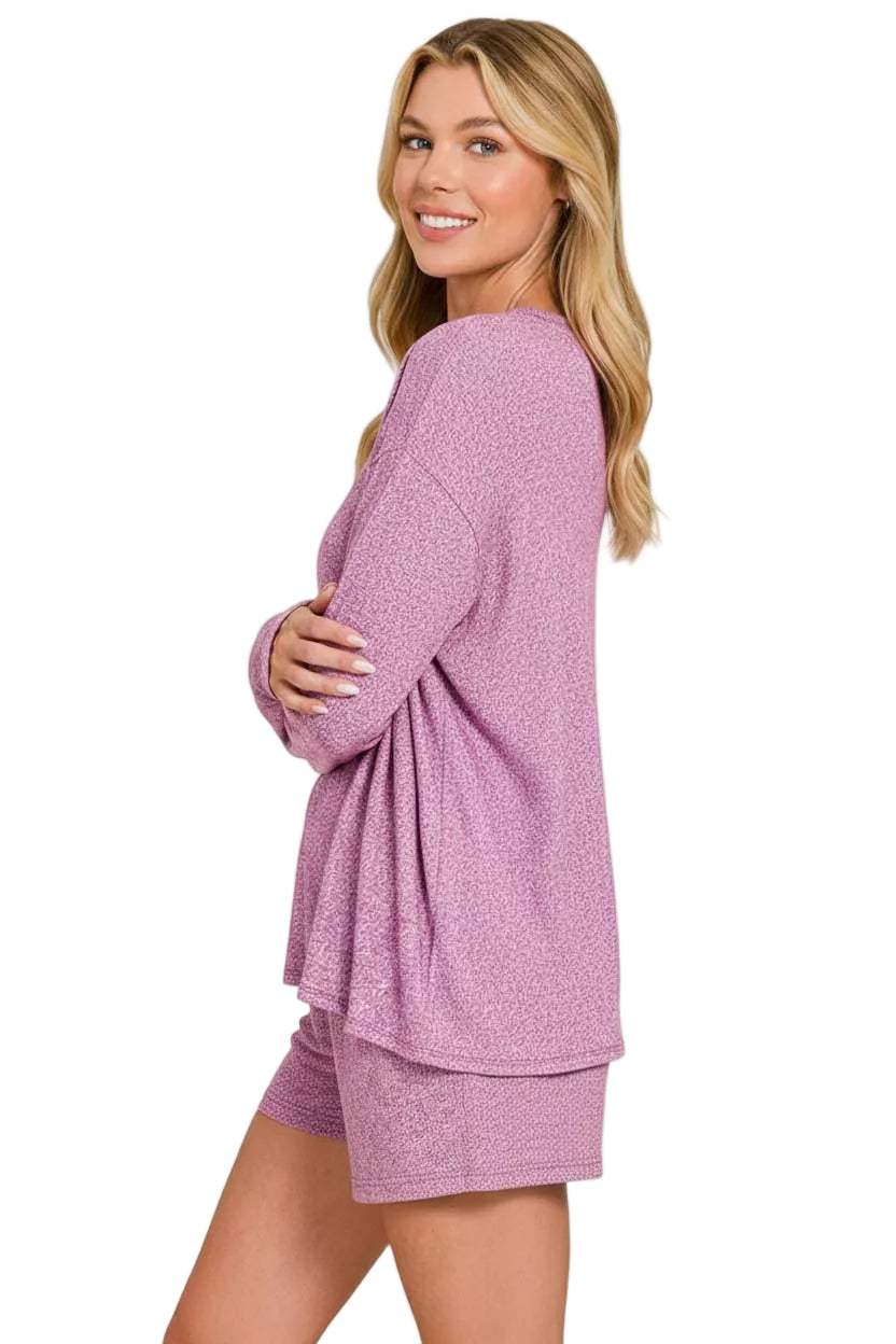 The long sleeves whisper warmth, while the shorts dance lightly around your legs, creating an effortless allure. Ideal for lazy afternoons or spontaneous outings, this matching ensemble invites you to indulge in relaxation, all while radiating a chic charm that captivates the heart.