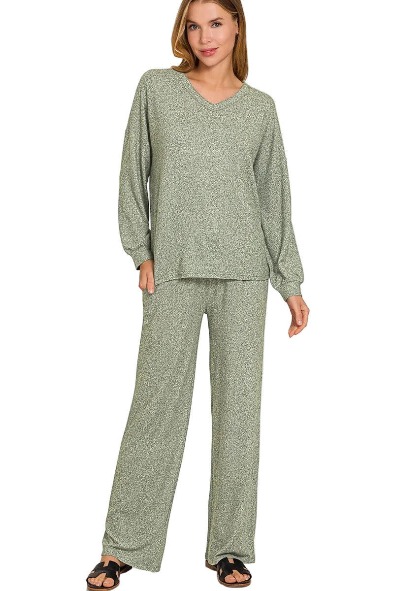 Embrace the gentle allure of the Zenana Soft Melange Long Sleeve Tee & Pants Set, where comfort meets elegance. The oversized V-neck top drapes gracefully, inviting you to indulge in its soft embrace, while the wide-leg pants flow effortlessly, creating a silhouette that dances with every step.