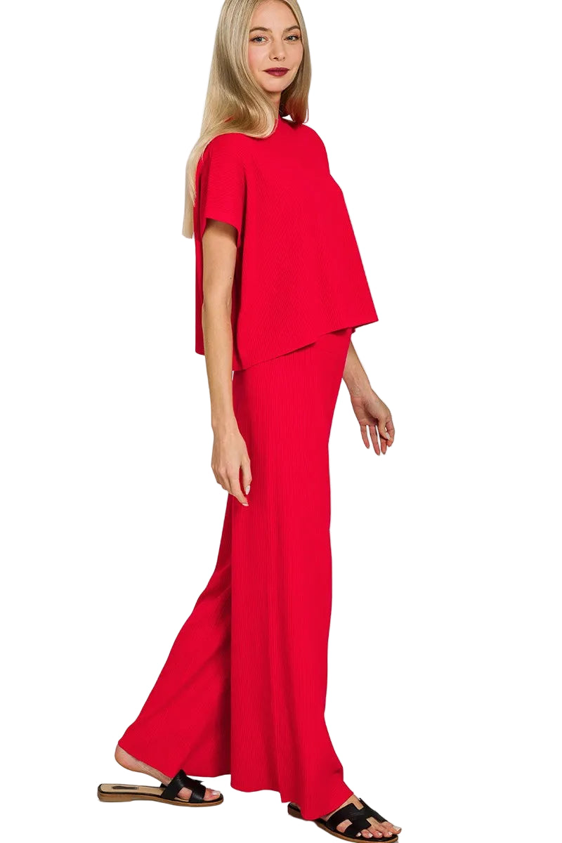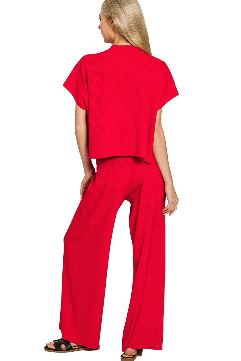 The short sleeve top, with its modern silhouette, dances gracefully with the relaxed-fit pants, creating a harmonious blend of style and ease. Perfect for intimate evenings or leisurely days, this set invites you to explore endless styling possibilities, igniting your passion for fashion.
